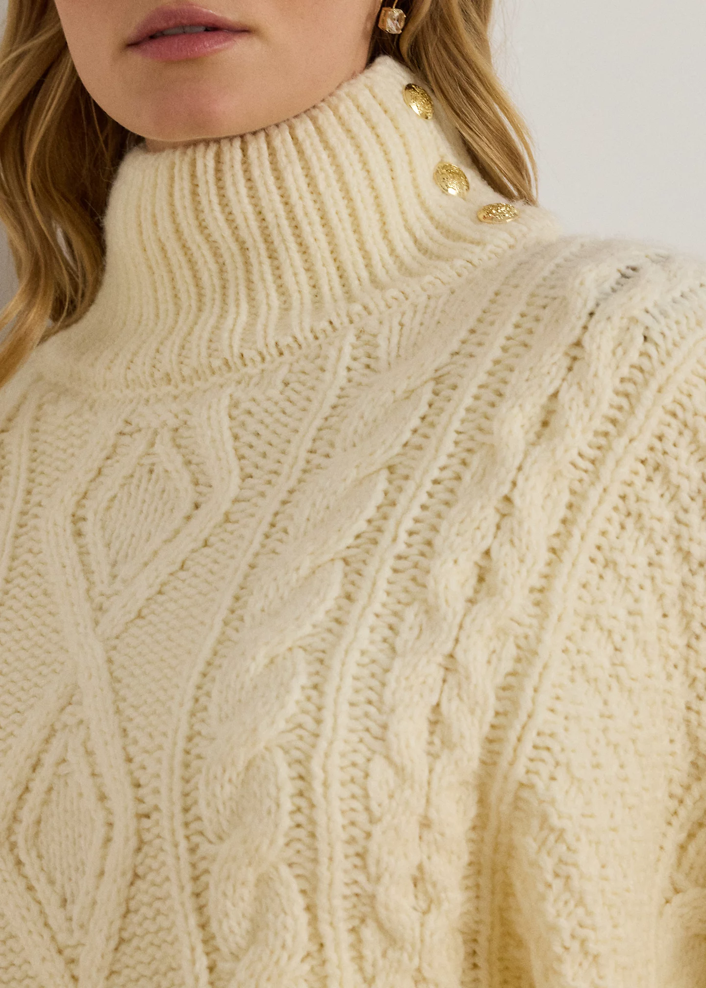- Ribbed mockneck. Three crest-embossed metal buttons at the neck.