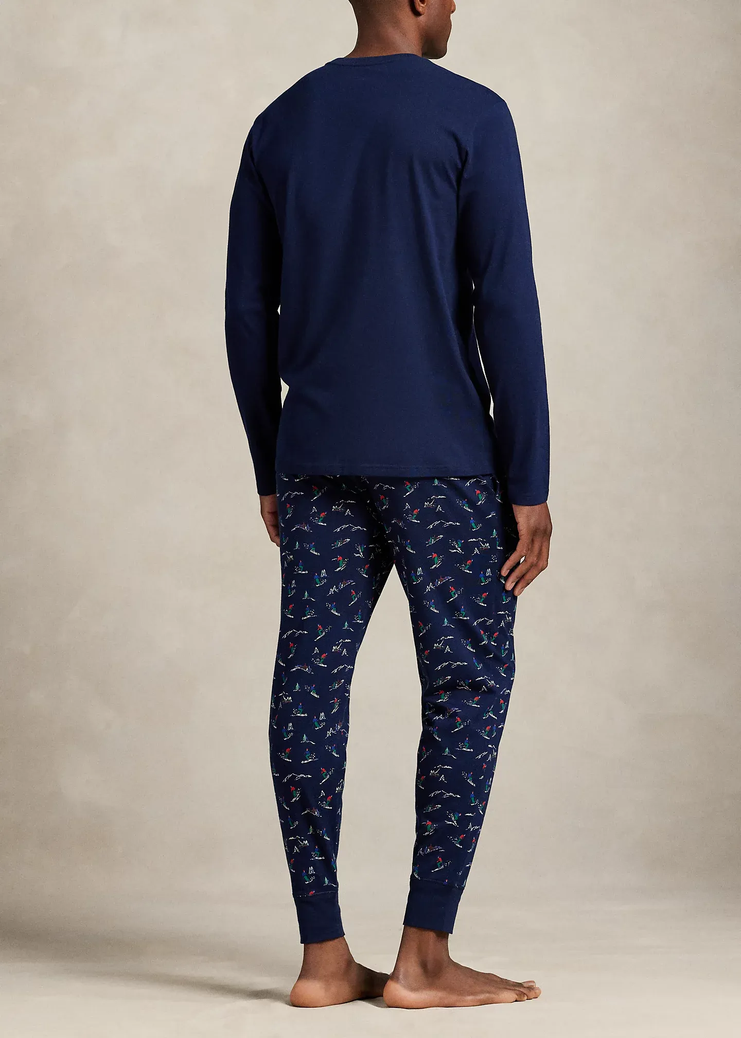 - “Polo” and “ralthtph lauthtren” script printed at the center front of the shirt. Allover signature print at the pant.